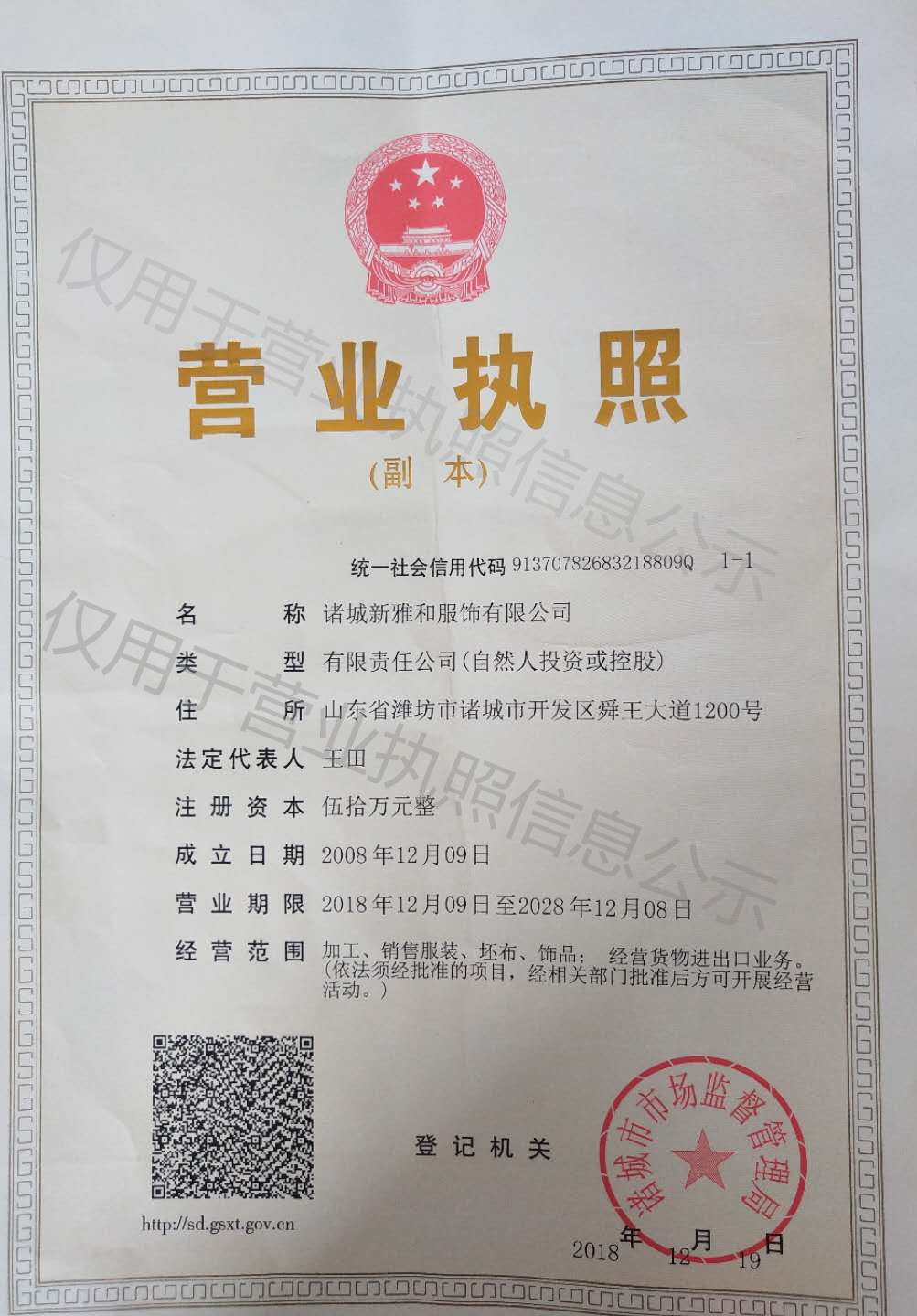 諸城新雅和服飾有限公司是一家擁有自營進(jìn)出口權(quán)、集貿(mào)工一體的現(xiàn)代化針織服裝加工出口企業(yè)。公司座落在諸城開發(fā)區(qū)橫四路北206國道以東。公司現(xiàn)有現(xiàn)代化日本進(jìn)口電腦縫制設(shè)備200多臺套,職工300人,年出口創(chuàng)匯1000萬美元。公司擁有一個團(tuán)結(jié)務(wù)實(shí)、業(yè)務(wù)嫻熟、反應(yīng)迅速、年輕化、現(xiàn)代化的管理團(tuán)隊(duì)。